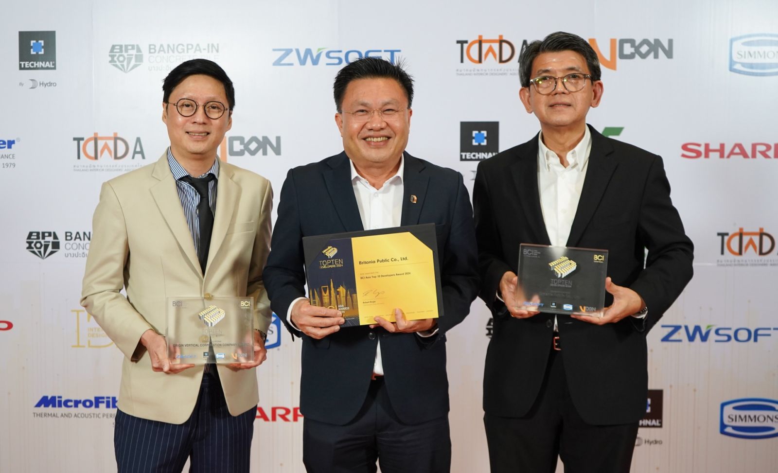 ตอกย้ำความสำเร็จ - นายธีรเดช เกิดสำอางค์ (กลาง) ประธานเจ้าหน้าที่บริหาร บริษัท บริทาเนีย จำกัด (มหาชน) หรือ BRI และ นายกฤษณ์ เตชะสัมมา (ซ้าย) ประธานเจ้าหน้าที่สายงานการตลาด บริษัท ออริจิ้น เวอร์ติเคิล คอร์ปอเรชั่น รับรางวัล “BCI Asia Top 10 Developers Awards 2024” จากการคัดเลือกให้เป็น 1 ใน 10 บริษัทพัฒนาอสังหาริมทรัพย์ดีเด่นของประเทศไทย ในงาน “BCI Asia Awards 2024” รางวัลจากผลงานออกแบบโครงการที่โดดเด่นทั้งในเรื่องของการออกแบบ คุณภาพ และคำนึงถึงผลกระทบต่อสิ่งแวดล้อม ทั้งคอนโดมิเนียมและบ้านจัดสรร