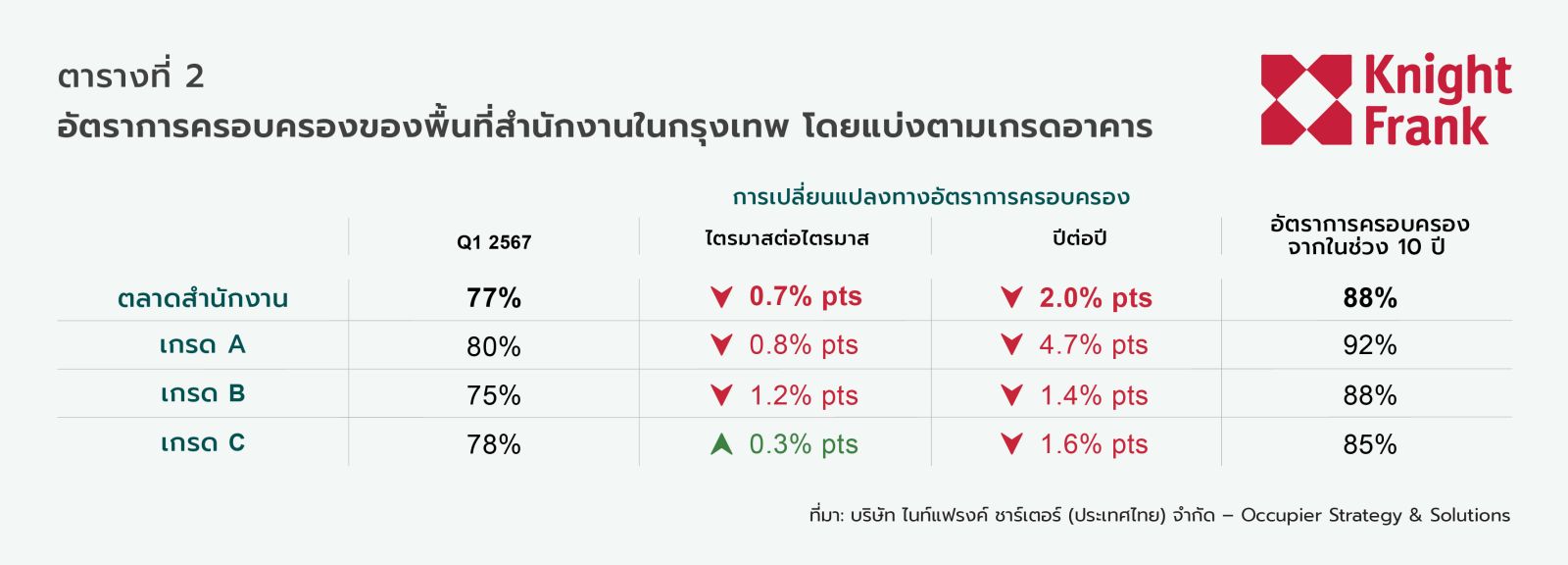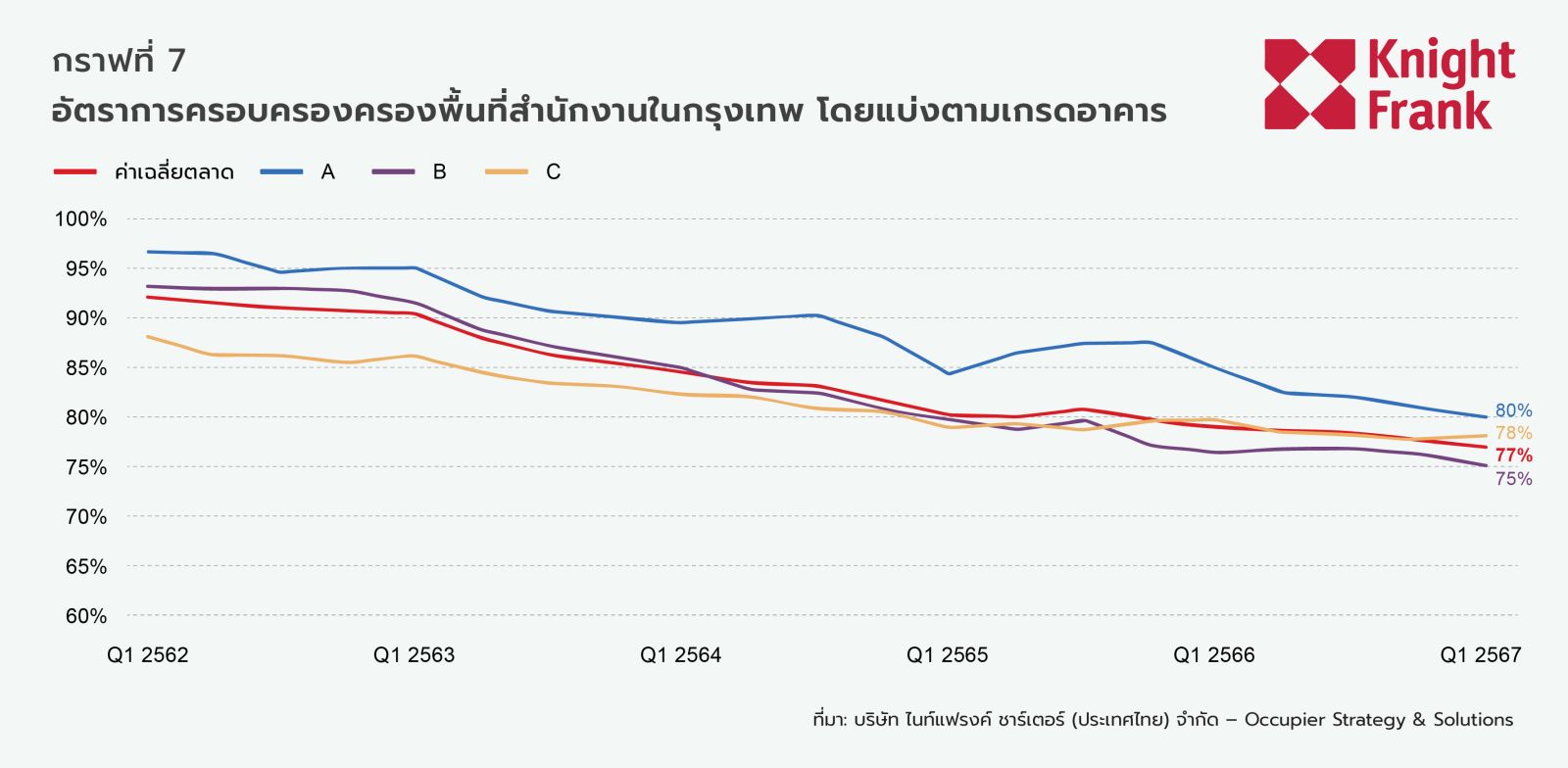 อัตราการครอบครองตลาดโดยรวมชะลอตัวลงเล็กน้อย ลดลง -0.7% ไตรมาสต่อไตรมาส เหลือ 77% สำนักงานเกรด A มีความแข็งแกร่ง โดยมีอัตราการครอบครองสูงสุดที่ 80% ถึงแม้ว่าอัตราการครอบครองลดลง 4.7% ปีต่อปี สาเหตุหลักมาจากแรงกดดันด้านอุปทาน ในทางกลับกัน สำนักงานเกรด B มีอัตราการครอบครองไม่ค่อยดีนักที่ 75% มีอาคารสำนักงานหลายแห่งที่ก่อนหน้านี้จัดอยู่ในเกรด A ถูกลดระดับลงเป็นเกรด B ทำให้ผู้เช่าเลือกเช่าอาคารใหม่ที่มีเกรดเดียวกันหรือสูงกว่า สำนักงานเกรด C เป็นกลุ่มเดียวที่อัตราการครอบครองเพิ่มขึ้นในไตรมาสนี้ โดยเพิ่มขึ้น 0.3% ไตรมาสต่อไตรมาส เป็น 78% เนื่องจากไร้แรงกดดันจากอุปทานใหม่และอัตราการย้ายสำนักงานของผู้เช่าลดลง