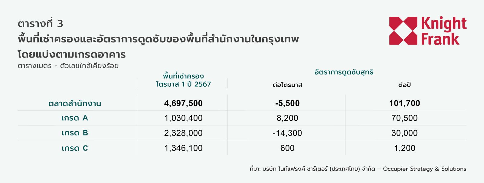 เมื่อพิจารณาถึงอุปสงค์ พื้นที่ปล่อยเช่าแล้วทั้งหมดในตลาดสำนักงานในกรุงเทพฯลดลง 5,500 ตร.ม. คิดเป็นพื้นที่เท่าเดิมที่ 4.70 ล้าน ตร.ม. ไตรมาสนี้การดูดซับสุทธิของสำนักงานเกรด B เริ่มติดลบ แต่ตลอดปีที่ผ่านมาทุกเกรดมีการดูดซับสุทธิเป็นบวก เกรด A มีการเข่าพื้นที่เพิ่มขึ้นมากที่สุดเมื่อเทียบกับปีก่อน โดยพื้นที่ปล่อยเช่าปีต่อปีอยู่ที่ 70,500 ตร.ม. หลักๆมาจากบริษัทขนาดใหญ่ที่มีชื่อเสียงที่มองหาอาคารสำนักงานใหม่ สิ่งอำนวยความสะดวกที่ทันสมัย ในทำเลที่สำคัญ นอกจากนี้ สำนักงานเกรด A เกือบครึ่งหนึ่งได้รับการรับรองอาคารสีเขียว ทำให้สำนักงานเหล่านี้มีความน่าสนใจเป็นพิเศษ โดยเฉพาะบริษัทที่ปฏิบัติตามกฎเกณฑ์ด้านสิ่งแวดล้อม สังคม และธรรมาภิบาล (ESG) อย่างเข้มงวด สำนักงานเกรด B มีพื้นที่ให้เช่ารวมเป็นลำดับ 2 เพิ่มขึ้นจากปีก่อน 30,000 ตร.ม. ในขณะที่เกรด C เพิ่มขึ้นเล็กน้อยที่ 1,200 ตร.ม. เมื่อเทียบกับปีก่อน แสดงให้เห็นถึงการขยายตัวอย่างต่อเนื่องในทุกเกรด โดยเฉพาะเกรดบน