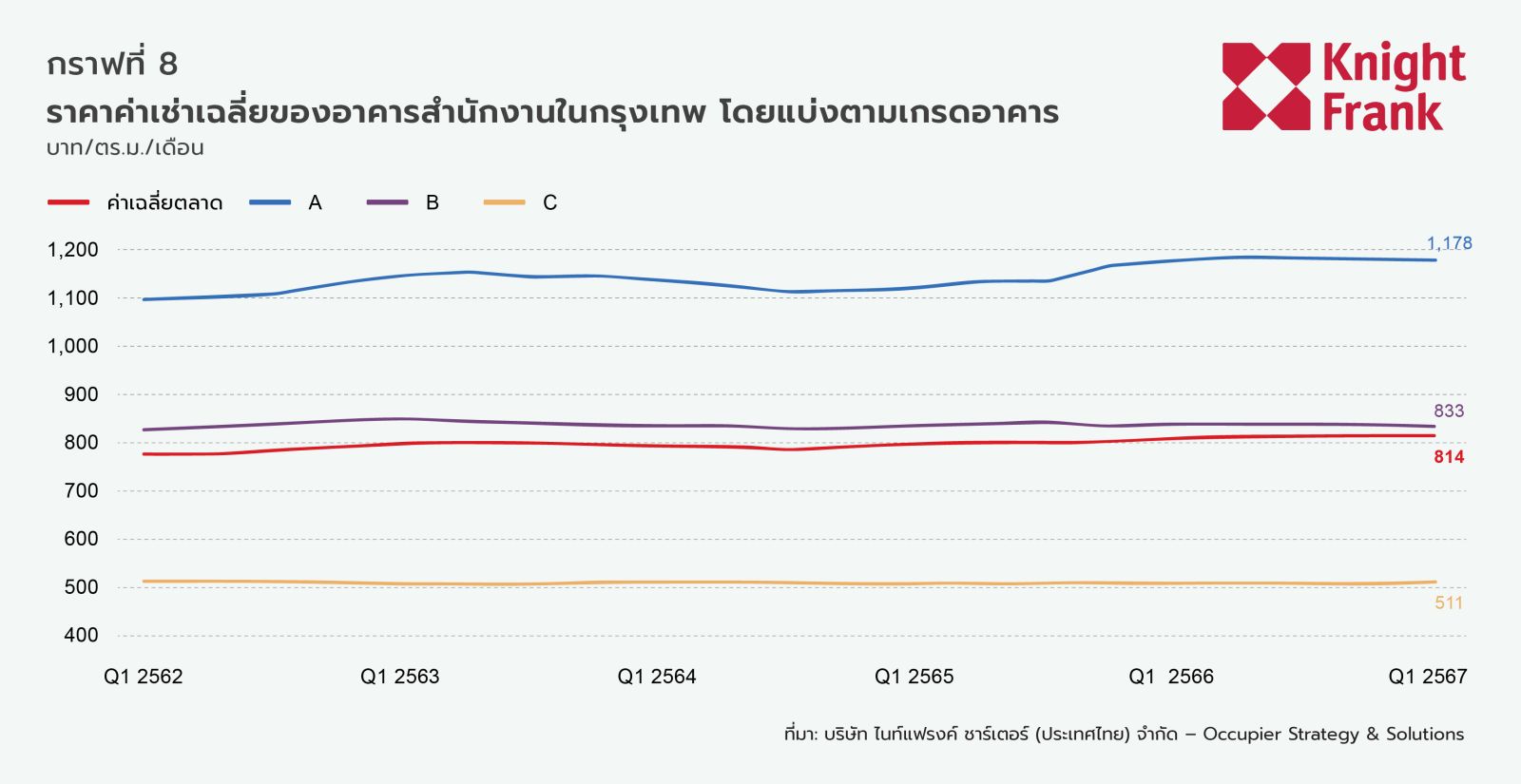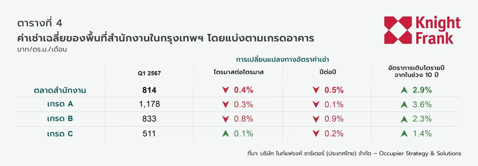 ในไตรมาสแรกของปี 2567 ตลาดอาคารสำนักงานในกรุงเทพฯ มีความต้องการลดลง ทำลายสถิติอัตราการดูดซับสุทธิเป็นบวก 7 ไตรมาสติดต่อกัน อัตราการดูดซับสุทธิติดลบ -5,500 ตารางเมตร ในขณะที่การเปลี่ยนแปลงอุปทานสุทธิเพิ่มขึ้น 52,700 ตารางเมตร การเปลี่ยนแปลงนี้ส่งผลให้อัตราการครอบครองเฉลี่ยในตลาดลดลงเล็กน้อย ลดลง 0.7% ไตรมาสต่อไตรมาส อยู่ที่ 77.0% แม้ว่าอัตราการครอบครองลดลง แต่อัตราค่าเช่ายังคงมีเสถียรภาพ โดยลดลงเล็กน้อยเพียง 0.2% ไตรมาสต่อไตรมาส ทำให้อัตราค่าเช่าเฉลี่ยอยู่ที่ 814 บาท ต่อตร.ม.ต่อเดือน ข้อพึงสังเกตในช่วงไตรมาสนี้คือความต้องการยูนิตที่มีขนาดเล็กลง ซึ่งสะท้อนถึงการปรับตัวของตลาดไปสู่โซลูชันสำนักงานที่มีขนาดกะทัดรัดและคุ้มค่าต่อต้นทุนมากขึ้น นอกจากนี้ มีแนวโน้มที่ชัดเจนของผู้เช่าที่เปลี่ยนจากโฮมออฟฟิศไปเป็นอาคารสำนักงานแบบดั้งเดิม โดยได้แรงหนุนจากความต้องการสิ่งอำนวยความสะดวกที่หลากหลายและเข้าถึงได้ง่ายมากขึ้น