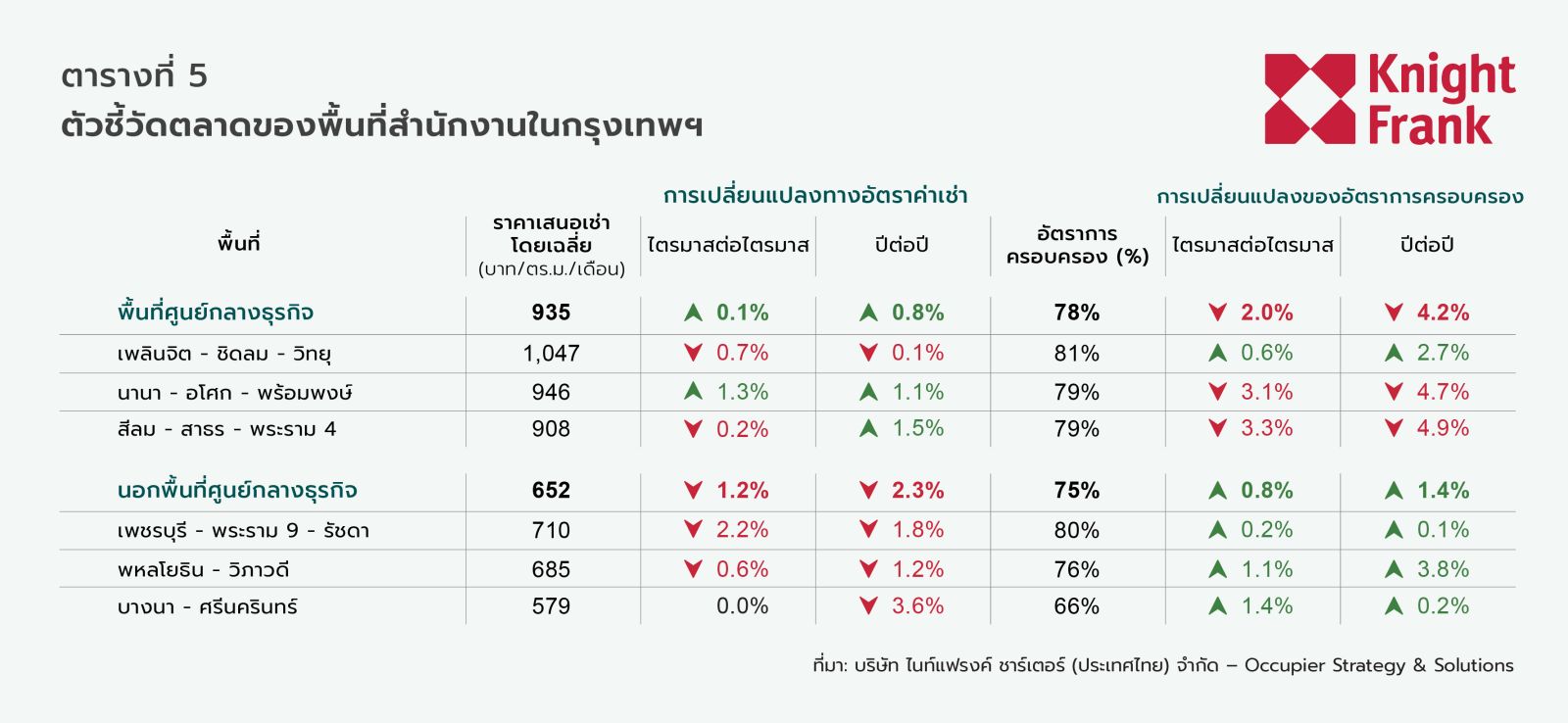 ค่าเช่าเฉลี่ยของอาคารย่านศูนย์กลางธุรกิจคงที่ที่ 935 บาทต่อตร.ม.ต่อเดือน ในขณะที่อัตราการครอบครองเฉลี่ยลดลง 2.0% ไตรมาสต่อไตรมาส อยู่ที่ 78% ย่านเพลินจิต-ชิดลม-วิทยุ มีผลการดำเนินงานแข็งแกร่ง โดยอัตราการครอบครองเพิ่มขึ้น 2.7% ปีต่อปี เป็น 81% ในขณะเดียวกัน อาคารสร้างเสร็จใหม่ล่าสุดในปีที่ผ่านมา ย่านนานา-อโศก-พร้อมพงษ์ และสีลม-สาทร-พระราม 4 ส่งผลให้ค่าเช่าเติบโตมากกว่า 1% ปีต่อปี แต่อัตราการครอบครองลดลงเกือบ 5% ปีต่อปี ในไตรมาสนี้ อัตราการดูดซับสุทธิของย่านศูนย์กลางธุรกิจลดลงเหลือติดลบ -26,300 ตร.ม. สาเหตุหลักมาจากการเพิ่มขึ้นของพื้นที่ว่างให้เช่าของอาคารสำนักงานเก่าย่านสีลม-สาทร-พระราม 4