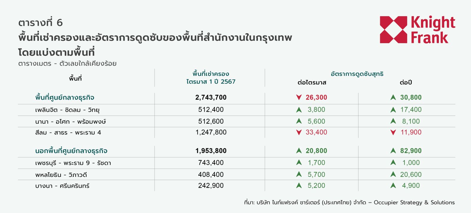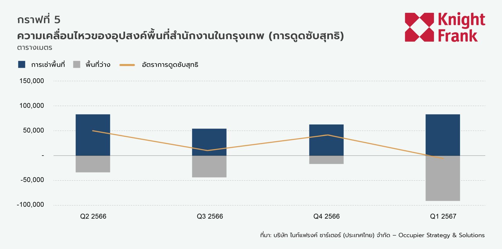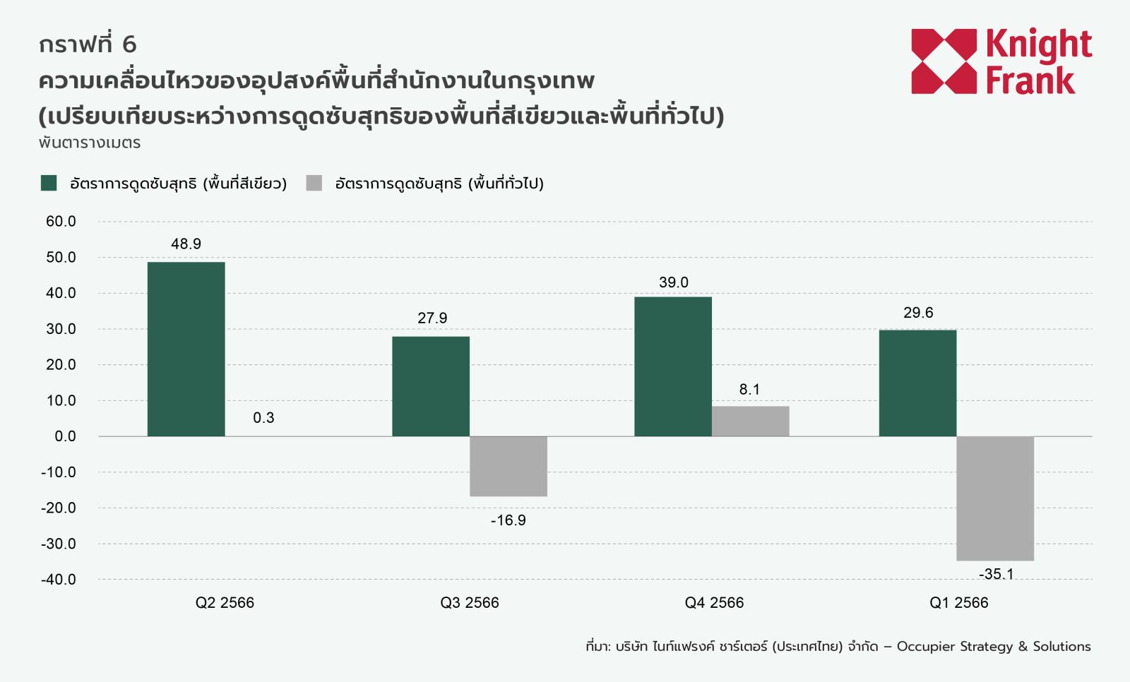 การดูดซับสุทธิของตลาดพื้นที่สำนักงานในไตรมาสนี้เท่ากับ -5,500 ตร.ม สิ้นสุดการดูดซับสุทธิที่แป็นบวก 7 ไตรมาสติดกัน นับตั้งแต่กลางปี 2565 การดูดซับสุทธิของพื้นที่สำนักงานสีเขียวในไตรมาสที่ 1 ยังคงแข็งแกร่งที่ 29,600 ตร.ม. ในขณะที่พื้นที่สำนักงานที่ไม่ใช่สีเขียวลดลงเหลือ -35,100 ตร.ม. ในปีที่ผ่านมา การดูดซับสุทธิตลอดทั้งปีมีเทรนด์การเช่าพื้นที่สำนักงานสีเขียวมากขึ้น โดยมีพื้นที่รวม 138,700 ตร.ม. ตรงกันข้ามกับการเช่าพื้นที่สำนักงานที่ไม่มีใบรับรองสีเขียวที่พื้นที่เช่าลดลง -37,000 ตร.ม.