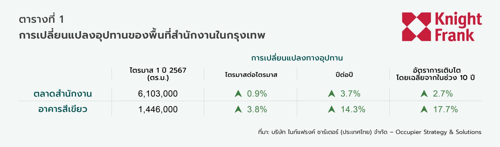 อุปทานอาคารสำนักงานทั้งหมดในกรุงเทพฯในไตรมาสนี้เพิ่มขึ้น 52,700 ตร.ม. หรือ 0.9% ไตรมาสต่อไตรมาส เป็น 6.10 ล้านตร.ม. มีอาคารสำนักงานใหม่ 2 แห่งสร้างแล้วเสร็จในไตรมาสที่ 1 ได้แก่ อาคารปัญญ์ ทาวเวอร์ บนถนนพระราม 4 และเจแอลเค ทาวเวอร์ เชื่อมต่อกับสถานีรถไฟฟ้านานา เนื่องจากอุปทานใหม่เป็นอาคารสำนักงานสีเขียวทั้งหมด พื้นที่สำนักงานสีเขียวให้เช่าจึงเพิ่มขึ้น 3.8% ไตรมาสต่อไตรมาส เป็น 1,446,000 ตร.ม. คิดเป็น 24% ของพื้นที่ให้เช่าทั้งหมดในตลาด