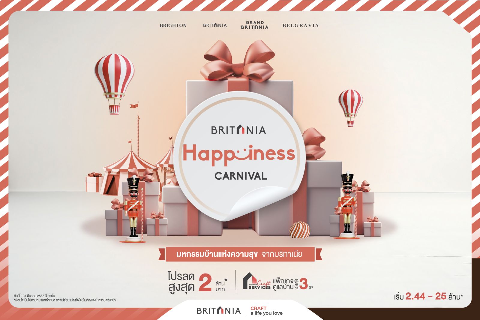 บริทาเนีย ผู้นำในการพัฒนาอสังหาริมทรัพย์ ที่มุ่งมั่นพัฒนาที่อยู่อาศัยเพื่อสังคมที่ดีอย่างยั่งยืน จัดโปรฯ พิเศษรับต้นปี BRITANIA HAPPINESS CARNIVAL มหกรรมบ้านแห่งความสุขจากบริทาเนีย ขนกองทัพบ้าน รวม 35 โครงการ นำโดย เบลกราเวีย, แกรนด์ บริทาเนีย, บริทาเนีย และไบรตัน เริ่ม 2.44 - 25 ล้าน* รับสิทธิพิเศษ 2 ต่อ ความสุขต่อที่1 ส่วนลดพิเศษทุกโครงการสูงสุด 2 ล้าน* ความสุขต่อที่ 2 รับแพ็คเกจบริการดูแลบ้านแบบครบวงจร Britania Craft Services ดูแลสูงสุด 3 ปี* สามารถติดตามข่าวสารและลงทะเบียน รับสิทธิพิเศษ เพียงจองและโอนกรรมสิทธิ์ ตั้งแต่วันนี้ – 31 มีนาคม 2567