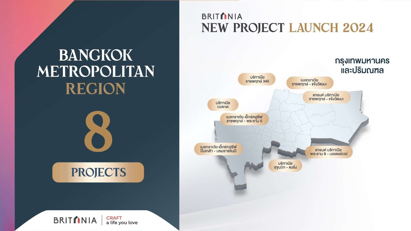 - Sustainable Growth Crafting รังสรรค์ธุรกิจสู่ความยั่งยืน กระจายการเติบโตไปยังหลากหลายเซ็กเมนท์ พัฒนาภายใต้ 3 แบรนด์หลัก ได้แก่ บริทาเนีย (Britania), แกรนด์ บริทาเนีย (Grand Britania) และเบลกราเวีย (Belgravia) เน้นบ้านเดี่ยว และบ้านแฝด ครอบคลุมระดับราคา 5 - 30 ล้าน* ซึ่งเป็นกลุ่มเซ็กเมนท์ที่กำลังซื้อยังแข็งแรงในหลากหลายทำเล ที่มีความต้องการซื้อในพื้นที่และ การแข่งขันยังไม่สูงมาก เพื่อวางรากฐานการกระจายโอกาสสู่ทำเลใหม่ๆ