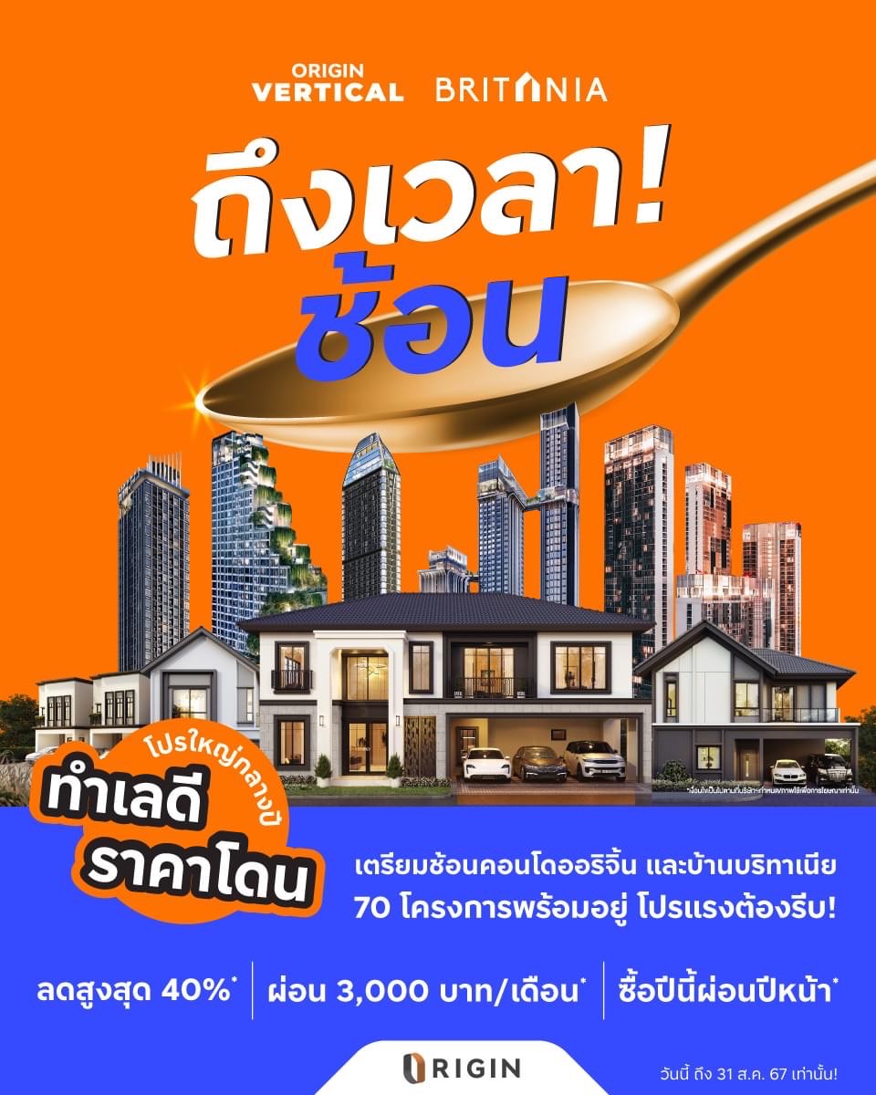 ออริจิ้น เวอร์ติเคิล ผนึกกำลัง บริทาเนีย ขนทัพคอนโดมิเนียมและบ้านพร้อมอยู่ทั่วไทยกว่า 70 โครงการ จัดอภิมหาแคมเปญ “ถึงเวลาช้อน” มอบที่สุดแห่งราคาและแพ็คเกจ เปิดทางผู้บริโภคช้อนซื้ออสังหาฯราคาเข้าถึงได้ บนทำเลดี ราคาดีที่สุด ชูคอนโดเลี้ยงสัตว์ได้ คอนโดใกล้รถไฟฟ้าหลากสาย และบ้านใกล้ทางด่วน ลดราคาแรงสูงสุดถึง 40% อัดโปรซื้อปีนี้ผ่อนปีหน้า ผ่อนต่ำเริ่ม 3,000 บาท คอนโด ราคาเริ่มต้น 1.49 ล้าน บ้าน ราคาเริ่มต้น 2.29 ล้าน พร้อมเข้าอยู่ได้ทันที ถึง 31 สิงหาคมนี้