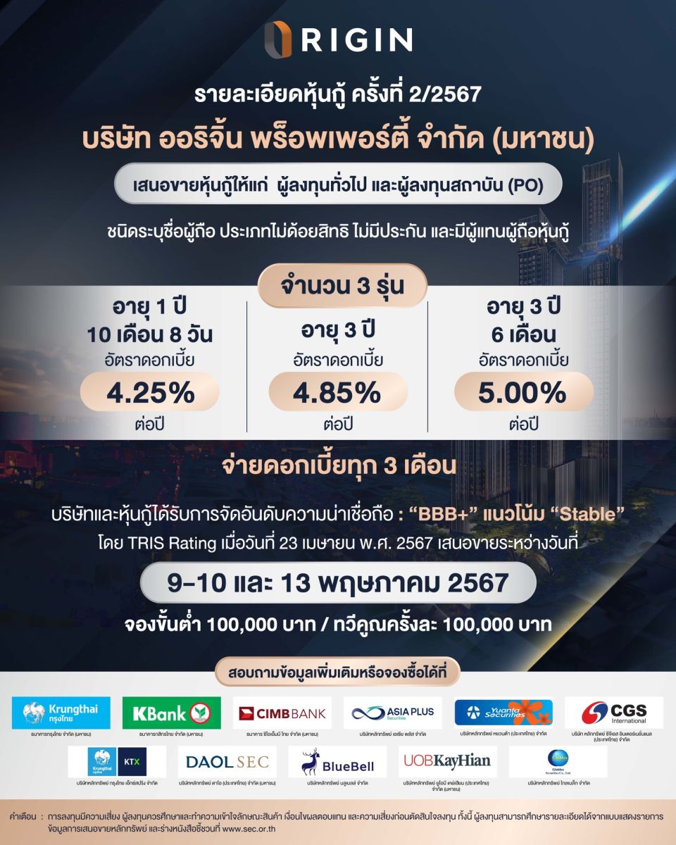 ออริจิ้น พร็อพเพอร์ตี้ หรือ ORI เตรียมเสนอขายหุ้นกู้ล็อตใหม่ 3 รุ่นแก่ผู้ลงทุนทั่วไปและผู้ลงทุนสถาบัน อายุ 1 ปี 10 เดือน 8 วัน อัตราดอกเบี้ย 4.25% ต่อปี อายุ 3 ปี อัตราดอกเบี้ย 4.85% ต่อปี และอายุ 3 ปี 6 เดือน อัตราดอกเบี้ย 5.00% ต่อปี จ่ายดอกเบี้ยทุก 3 เดือน เสนอขายวันที่ 9-10 และ 13 พฤษภาคมนี้ ผ่าน 11 สถาบันการเงินชั้นนำ ด้วยอันดับความน่าเชื่อถือที่ระดับ “BBB+/Stable” จากทริสเรทติ้ง หวังนำเงินไปใช้ซื้อที่ดินพัฒนาโครงการใหม่ ชำระคืนหนี้เดิมและใช้หมุนเวียนในกิจการ พร้อมเดินหน้าเปิดโครงการใหม่ปี 2567 ตามแผนงาน 35 โครงการ มูลค่า 37,000 ล้านบาท