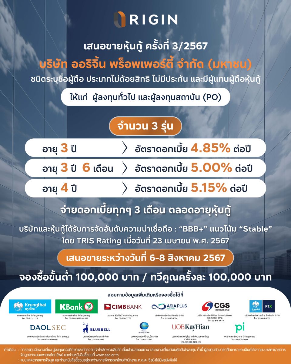 ออริจิ้น พร็อพเพอร์ตี้ หรือ ORI เตรียมเสนอขายหุ้นกู้ล็อตใหม่ 3 รุ่นแก่ผู้ลงทุนทั่วไปและผู้ลงทุน สถาบัน อายุ 3 ปี อัตราดอกเบี้ย 4.85% ต่อปี อายุ 3 ปี 6 เดือน อัตราดอกเบี้ย 5.00% ต่อปี และอายุ 4 ปี อัตราดอกเบี้ย 5.15% ต่อปี จ่ายดอกเบี้ยทุก 3 เดือน เสนอขายวันที่ 6-8 สิงหาคมนี้ ผ่าน 12 สถาบันการเงินชั้นนำ ชูระดับความน่าเชื่อถือ “BBB+/Stable” จากทริสเรทติ้ง มั่นใจแบ็คล็อกแกร่ง 46,571 ล้าน ทยอยรับรู้รายได้ต่อเนื่องถึงปี 2571 เปิดตลาดต่างชาติโกยยอดขายกว่า 2,500 ล้านบาท ในครึ่งปีแรก และปิดดีลขายบิ๊กล็อตคอนโดให้ “เดลต้า” กว่า 1,000 ล้านบาท