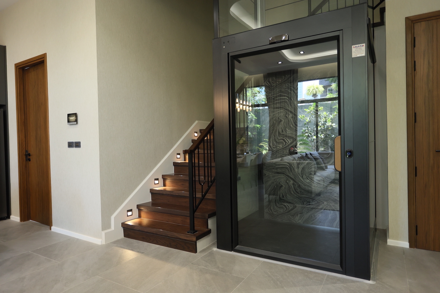 เมื่อเดินเข้ามาภายในบริเวณบ้าน จะพบกับความโล่งโปร่งสบายด้วยเพดานที่สูง 3.2 เมตร และประตูกระจกเทมเปอร์ (Tempered Glass) ซึ่งเป็นกระจกนิรภัยบานใหญ่ที่ปลอดภัยกว่ากระจกทั่วไปถึง 4-5 เท่า เพื่อป้องกันแสงและความร้อน ด้วยความหนาเป็นพิเศษถึง 6 มม. พร้อมเชื่อมต่อให้ผู้อยู่อาศัยได้สัมผัสถึงธรรมชาติสีเขียวรอบบ้านที่โอบกอดเราไว้