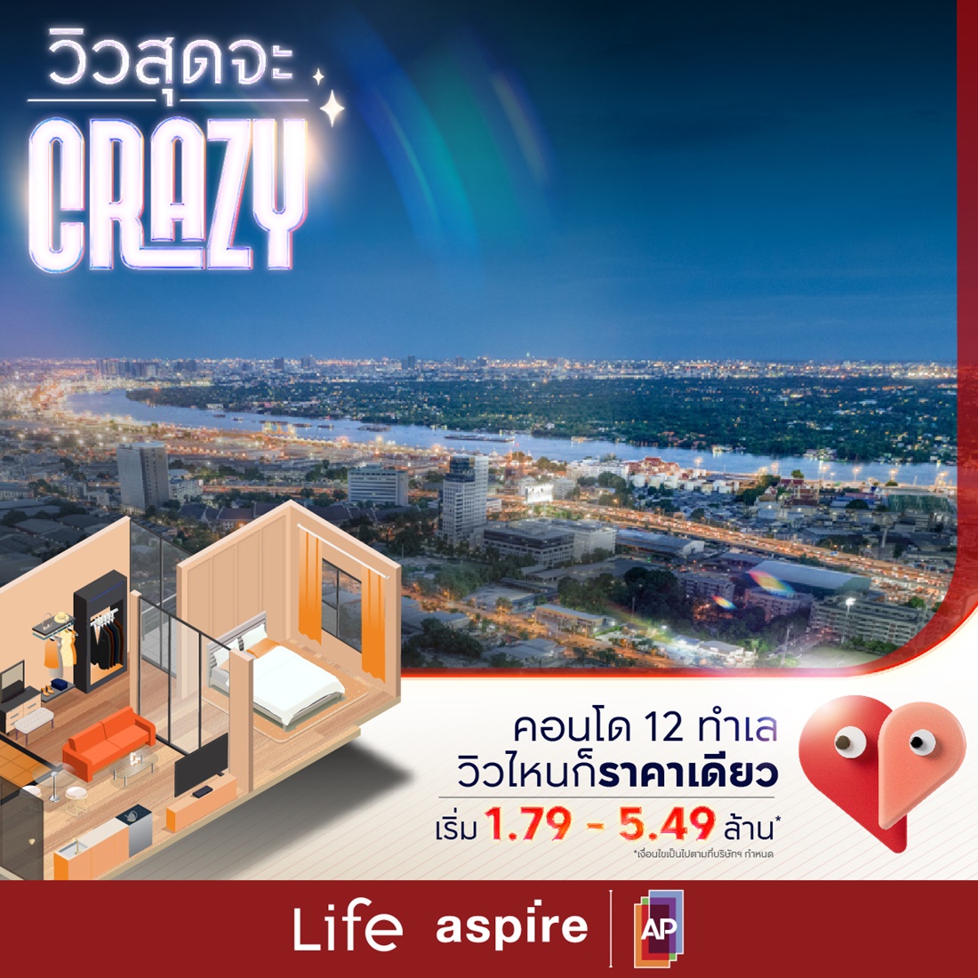 วันนี้ - 15 ก.ย.นี้ พบกับเอพีคอนโดแบรนด์ LIFE และ ASPIRE ใน12 ทำเลที่…ที่ดีที่สุด จัดแคมเปญพิเศษ ‘วิวสุดจะ CRAZY’ วิวไหนก็ราคาเดียว 1.79 – 5.49 ล้านบาท