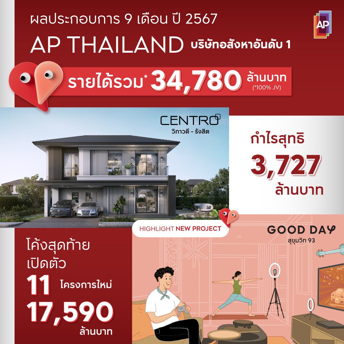 เอพี ไทยแลนด์ ย้ำบริษัทอสังหาอันดับ 1 ประกาศรายได้รวม 9 เดือน 34,780 ล้าน กำไรสุทธิสูงถึง 3,727 ล้าน