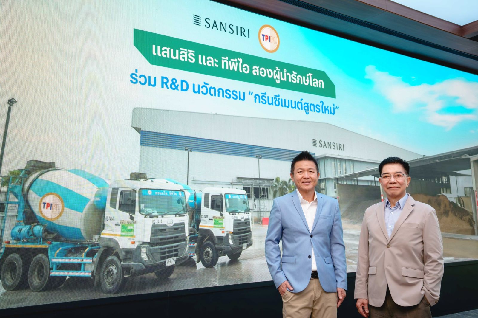 จากภาพซ้ายไปขวา: บริษัท แสนสิริ จำกัด (มหาชน) โดยนายอาณัติ กิตติกุลเมธี รองกรรมการผู้จัดการอาวุโสสายงานพัฒนาโครงการแนวราบ และ บริษัท ทีพีไอ คอนกรีต จำกัด โดยนายปัญญา แต่งสิงห์ตรง กรรมการผู้จัดการ ผนึกกำลังสานต่อเจตนารมย์สองผู้นำองค์กรรักษ์โลก ร่วมวิจัยและพัฒนานวัตกรรมปูนซีเมนต์รักษ์โลก สูตรใหม่ลดโลกร้อน ซึ่งจะนำมาใช้ในทุกโครงการของแสนสิริทั้งโครงการแนวราบและคอนโดมิเนียม