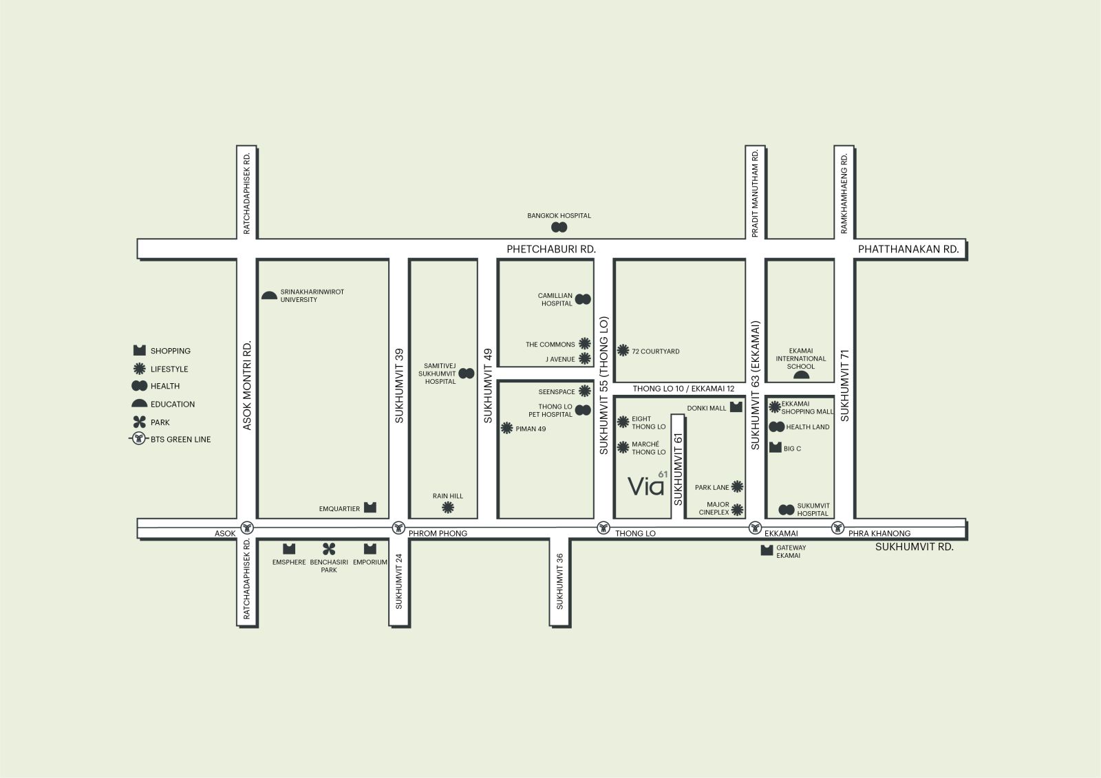 Via 61 ลักซ์ชัวรี่คอนโดมิเนียมแบบ low-rise ใจกลางย่านสุขุมวิท สูง 8 ชั้น (ระหว่างเอกมัย – ทองหล่อ) ออกแบบในคอนเซ็ปต์ “Unveil Your Living Serenity” หนึ่งใน Aesthetic Collection จากแสนสิริ ตั้งอยู่บนทำเลเอกมัย-สุขุมวิท 61 ตอบโจทย์ทุกไลฟ์สไตล์การอยู่อาศัย ขนาดพื้นที่ตั้งแต่ 50 – 187 ตร.ม. ตั้งแต่ห้องขนาด 1 ห้องนอน ไปจนถึง Penthouse กับความเป็นส่วนตัวเพียง 61 ยูนิต เดินทางสะดวกเพียง 1 นาที จาก BTS เอกมัย และ 3 นาทีจากทองหล่อ ใกล้แหล่งศูนย์รวมไลฟ์สไตล์