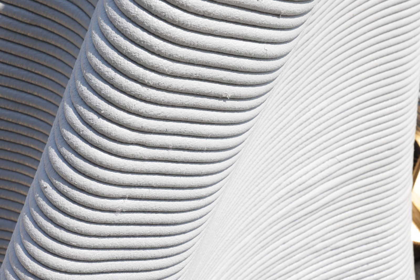 ด้านนายพชร เรือนทองดี Digital Fabrication Director จาก ดีไซร์ซินธีซิส เผยว่า สำหรับการพิมพ์ขึ้นรูปตัว Catenary Arch เราใช้ 3D Printing 6 แกน เป็นเครื่องมือในการรังสรรค์ขึ้นมา ซึ่งมีการใช้หัวพิมพ์ถึง 2 ลักษณะ ที่แตกต่างกัน โดยส่วนเก้าอี้นั่งด้านล่าง ชั้นคอนกรีตจะมีขนาดเล็กกว่าและมีลักษณะการเรียงเหมือนชั้นเค้กที่เรียง