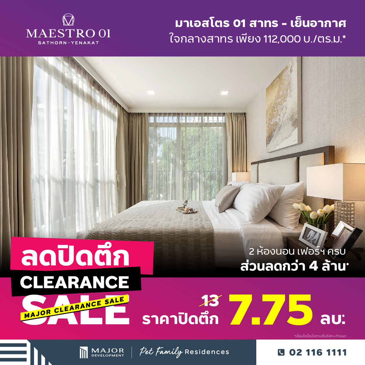 • มาเอสโตร 01 สาทร-เย็นอากาศ คอนโดมิเนียม (MAESTRO 01 Sathorn-Yenakat) คอนโดมิเนียมสไตล์ยุโรปคลาสสิค ติดถนนเย็นอากาศ ใจกลางสาทร นำเสนอห้องชุดพร้อมอยู่ เฟอร์นิเจอร์ครบ 2 ห้องนอน ขนาดพื้นที่ 69.49 ตารางเมตร นำเสนอความพิเศษ ด้วยราคาที่ดีที่สุด 7.75 ล้านบาท เพียง 112,000 บาทต่อตารางเมตร