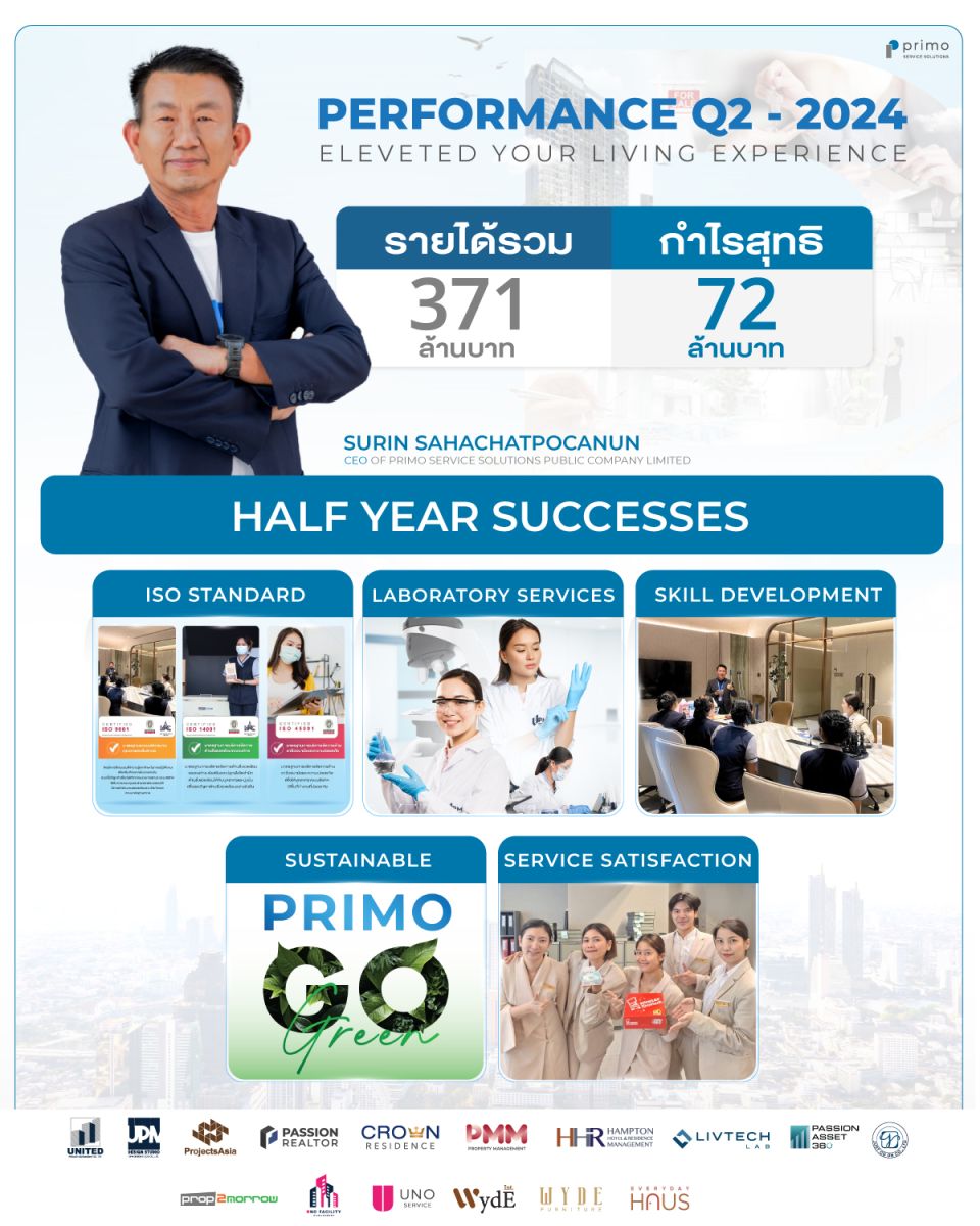 นายสุรินทร์ สหชาติโภคานันท์ ประธานเจ้าหน้าที่บริหาร บริษัท พรีโม เซอร์วิส โซลูชั่น จำกัด (มหาชน) เปิดเผยว่าจากผลการดำเนินงานไตรมาส 2/2567 (เม.ย.- มิ.ย.) ที่ผ่านมา PRI มีรายได้อยู่ที่ 371 ล้านบาท และมีกำไรสุทธิรวมอยู่ที่72 ล้านบาท ทั้งนี้ PRI ยังคงมุ่งมั่นกับการเติบโตแบบมั่นคงและยั่งยืน และใส่ใจทุกปัจจัยที่เกี่ยวข้องกับงานบริการอย่างเต็มกำลัง โดยในไตรมาส 2/2567 ที่ผ่านมาบริษัทฯให้ความสำคัญกับการสร้างมาตรฐานระดับสากล ทั้งในเรื่องของของมาตรฐานองค์กรการพัฒนาบุคคลากร เพื่อขยายฐานลูกค้ามากขึ้น สำหรับในช่วงครึ่งปีแรก 2567 ที่ผ่านมา PRI และบริษัทในเครือได้ร่วมกันเดินหน้าสร้างมาตรฐาน ผ่านธุรกิจต่างๆเพื่อสร้างการเติบโตอย่างแข็งแกร่งซึ่งประกอบไปด้วย