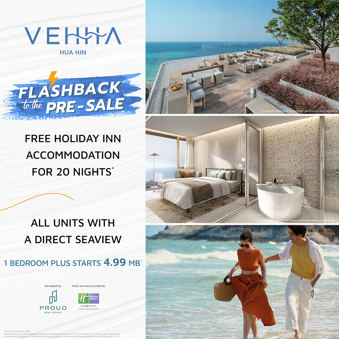PROUD จัดโปรโมชันสุดร้อนแรง "Flashback to the Pre-Sale” กลับมาอีกครั้งกับราคา Pre-Sale โครงการ “เวหา หัวหิน” (VEHHA Hua Hin) คอนโดฯระดับลักชัวรี ใจกลางเมืองหัวหิน พร้อมด้วย Fully Furnished แต่งครบจบทุกห้อง ที่คุ้มค่าเพื่ออยู่อาศัยเองและลงทุน มอบส่วนลดพิเศษทุกยูนิตสวย วิวทะเลทุกยูนิต* พร้อมรับฟรี!! ที่พักโรงแรม ฮอลิเดย์ อินน์ รีสอร์ต วานา นาวา หัวหิน 20 คืน* และฟรีสิทธิ์เข้าสวนน้ำ วานา นาวา หัวหิน 5 ปี* สามารถใช้สิทธิได้ทันทีหลังทำสัญญา ทั้งโรงแรมและสวนน้ำ ที่ตั้งอยู่ติดกับพื้นที่โครงการเวหา ที่ลูกค้าจะได้รับประสบการณ์ในการอยู่อาศัยอย่างเต็มอิ่ม ตั้งแต่วันนี้เป็นต้นไป โดยไม่ต้องรอการก่อสร้างแล้วเสร็จ ในไตรมาส 3 ปี 2568 รวมถึง สิทธิพิเศษมากมายจาก Proud Privileges เพียงลงทะเบียนรับส่วนลดสูงสุด 500,000 บาท* โอกาสดีๆ คุ้มค่าเพื่ออยู่เองและลงทุน ที่ใครก็ไม่ควรพลาด ตั้งแต่วันนี้ – 31 มี.ค. 2567