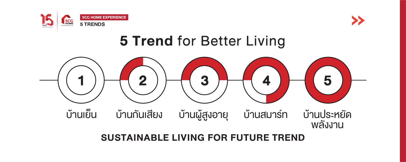 ขณะที่ 5 เทรนด์บ้านในรูปแบบ Sustainable Living ได้แก่ บ้านเย็น บ้านสมาร์ท บ้านผู้สูงอายุ บ้านกันเสียง และบ้านประหยัดพลังงาน โดยการนำสินค้าในกลุ่ม SCG Green Choice มาใช้ โดยเน้นการลดโลกร้อน ลดการใช้พลังงาน ลดการปล่อยก๊าซเรือนกระจก ลดทรัพยากร และยืดอายุการใช้งานให้นานขึ้น ช่วยสร้างสุขภาวะที่ดีในการอยู่อาศัยและมีสภาพแวดล้อมเหมาะแก่การอยู่อาศัย นอกจากนี้ได้จัดทำกระบวนการ Partner Management เพื่อร่วมทำงานกับพาร์ทเนอร์เพื่อให้เกิดเศษวัสดุเหลือใช้ให้น้อยที่สุด เริ่มตั้งแต่การเข้าสำรวจวัดขนาดการติดตั้ง เตรียมอุปกรณ์ให้เหมาะกับหน้างาน ซึ่งสามารถช่วยลดเศษวัสดุ ลดการเกิดมลพิษทางเสียงและทางอากาศที่หน้างานได้