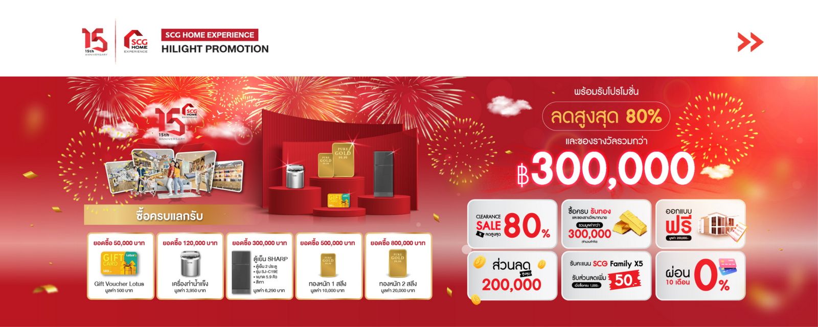 ทั้งนี้เนื่องในโอกาสครบรอบ 15 ปี บริษัทได้จัดงาน ‘ฉลองครบ 15 ปี ช้อปสนุก จัดหนักเรื่องบ้านกับ SCG HOME Experience’ โดยมีโปรโมชันพิเศษให้กับเจ้าของบ้านที่มีแผนในการทำบ้าน ในงานสามารถช้อปสินค้าที่ลดสูงสุด 80% และโปรโมชันซื้อครบรับทอง แลกรับทองสูงสุด 2 สลึง รวมถึงการออกแบบบ้าน ฟรี และโปรโมชัน ON TOP พิเศษในการใช้บริการพร้อมติดตั้ง นอกจากนี้ยังมีกิจกรรม มีปัญหาเรื่องบ้าน ต้องแวะมา ‘คลินิกหมอบ้าน’ ชวนไขปัญหาและหาแนวทางแก้ไขเรื่องบ้าน พบกับกูรูเรื่องบ้านตลอด 4 วัน เต็มอิ่มกับประสบการณ์การทำบ้านให้แง่มุมต่างๆ พร้อมกับกิจกรรมสาย Handmade นำของเหลือใช้มาประดิษฐ์เป็นของใช้ต่อยอดธุรกิจได้ พบกันวันที่ 4-7 กรกฎาคม 2567 เวลา 10.00 – 19.00 น. ณ SCG HOME Experience เลียบทางด่วนเอกมัย - รามอินทรา ติดตามรายละเอียดข้อมูลเพิ่มเติมได้ที่เฟสบุ๊ค https://www.facebook.com/SCGHomeExperience หรือเว็บไซต์