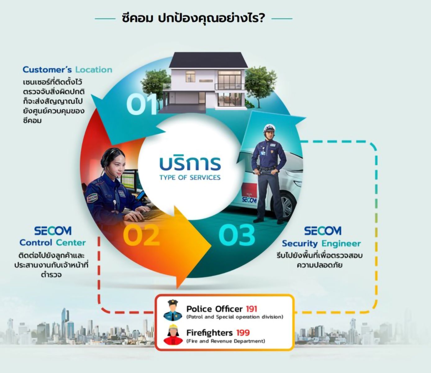 ซีคอม (SECOM) ผู้ให้บริการระบบรักษาความปลอดภัยอันดับหนึ่งจากประเทศญี่ปุ่น จึงได้พัฒนาบริการ Smart Security เพื่อตอบสนองความต้องการด้านความปลอดภัยของทุกครอบครัว และล่าสุดก็ได้เปิดตัวบริการ Smart Security Care เพื่อมาตอบโจทย์การดูแลผู้สูงวัยที่อยู่อาศัยเพียงลำพัง ภายใต้คอนเซ็ปต์ Caring By Your Side ด้วยโซลูชันอัจฉริยะที่ทำให้สมาชิกในครอบครัวรู้สึกใกล้ชิดกันมากขึ้น แม้จะอยู่คนละที่ก็อุ่นใจไร้กังวล ทั้งด้านความปลอดภัย ด้วยระบบรักษาความปลอดภัยตลอด 24 ชั่วโมงโดยทีมปฏิบัติการมืออาชีพ ด้านสุขภาพ ช่วยให้สามารถติดตามกิจกรรมในแต่ละวันของผู้สูงวัยได้สะดวกผ่านแอปพลิเคชัน จับสังเกตแม้การเปลี่ยนแปลงเพียงเล็กน้อย และ ด้านการช่วยเหลือฉุกเฉิน แจ้งเตือนทั้งสมาชิกในครอบครัวและ SECOM ในกรณีที่เกิดเหตุฉุกเฉิน SECOM จะช่วยประสานงานจัดเตรียมรถพยาบาลตามความจำเป็น