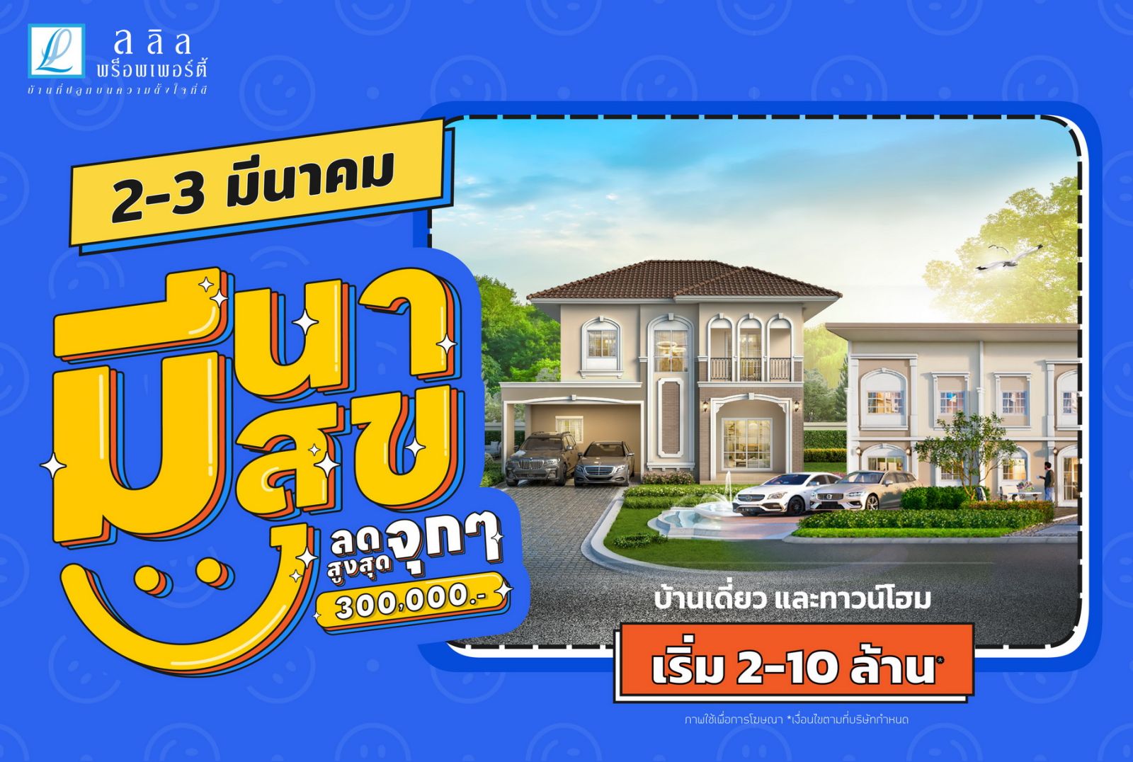 “มีนา มีสุข ลดจุกๆ สูงสุด 3 แสน” 2-3 มี.ค.นี้ ลลิล พร็อพเพอร์ตี้ มอบโปรโมชั่นดีๆที่คนอยากมีบ้านเห็นแล้วต้องยิ้ม