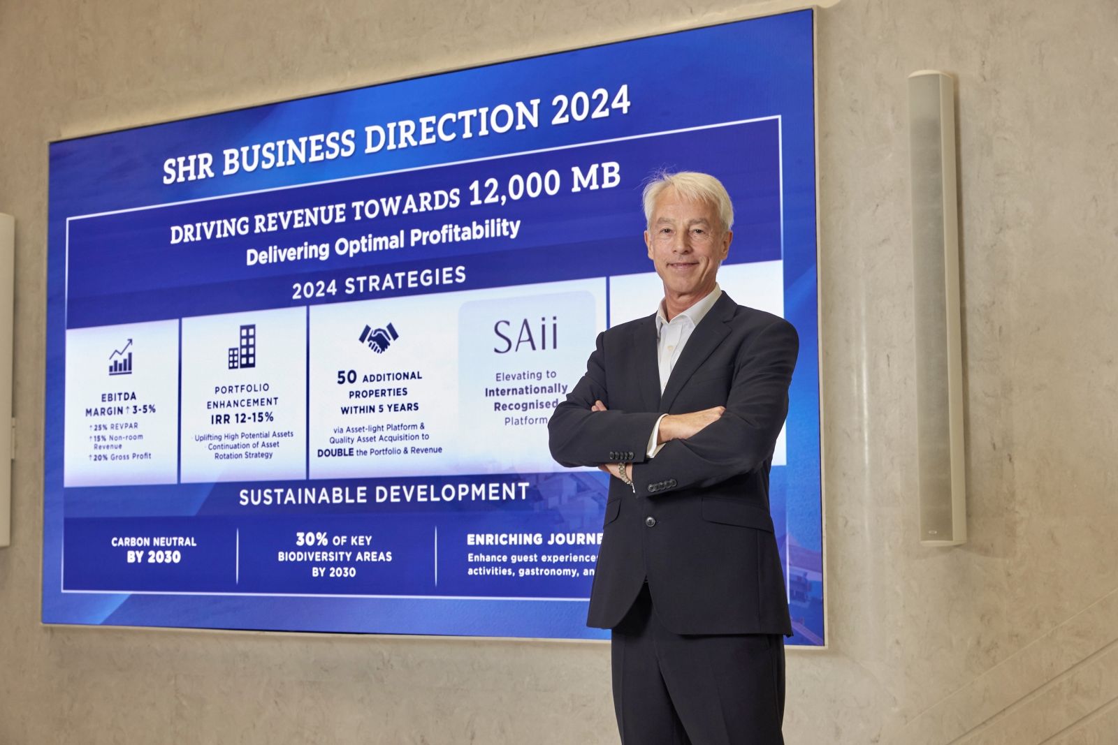 BANGKOK, THAILAND: 31 January 2024 – S Hotels and Resorts PCL (SET: SHR), the international hospitality company from Singha Estate PCL (SET: S), announced business strategies to boost profitability with the target to achieve THB 12 billion in total revenue for 2024 across five markets globally. Aiming to earn 3-5% increase in EBITDA margin, the company puts greater focus on operational efficiency to maximize bottom line, portfolio enhancement through room renovation and repositioning of core assets in prime locations, uplift of SAii brand to offer exceptional customer experience while pursuing an asset-light platform, and expansion through M&A opportunities. Under the sustainability commitment, S Hotels & Resorts has also implemented plans to enrich stay experiences with learning activities and gastronomy with strong local connections.
