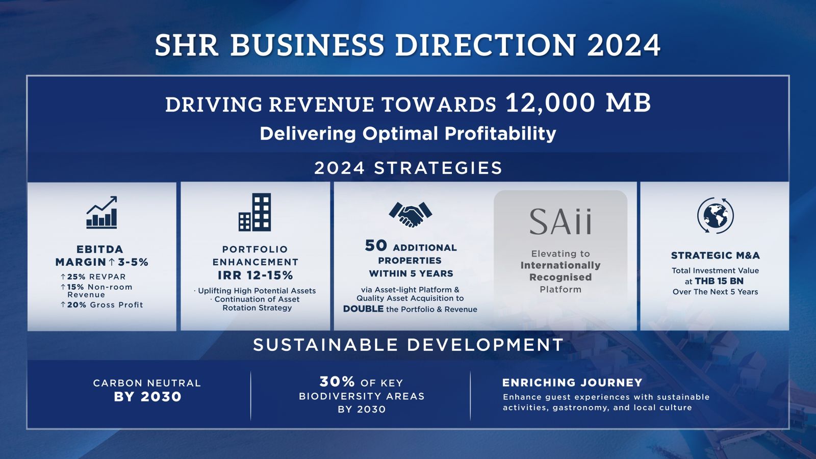 For 2024, S Hotels & Resorts is working towards the main goal of boosting profitability. By continuing driving efficiency and focusing on growth, the company aims to generate THB 12 billion in revenue and drives dynamic and diversified growth in four areas: