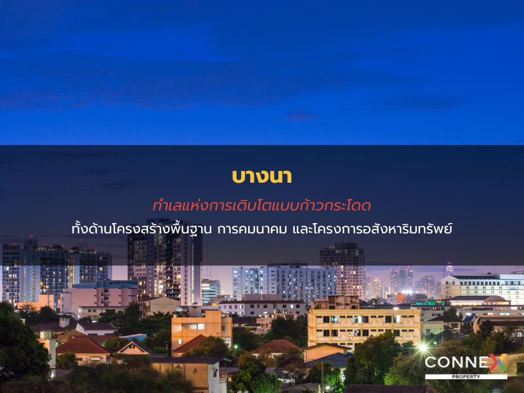 บางนาเป็นทำเลที่มีการพัฒนาควบคู่ไปกับโครงสร้างพื้นฐานขนาดใหญ่ เช่น สนามบินสุวรรณภูมิ, รถไฟฟ้า BTS และทางด่วนหลายสาย