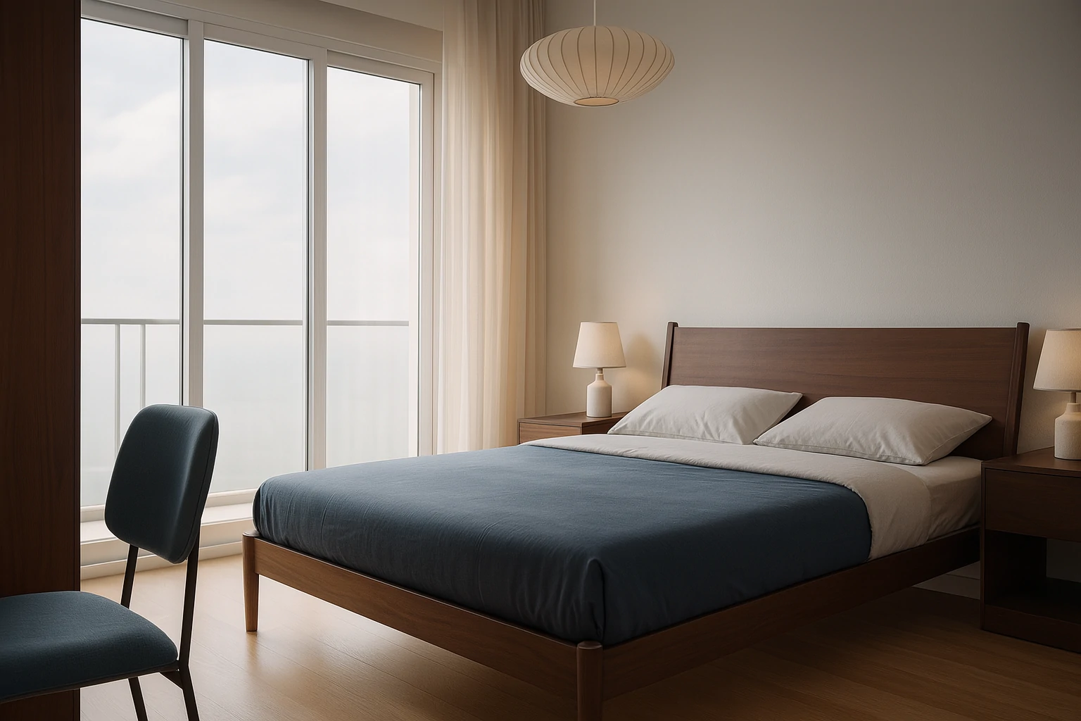ห้องนอนสไตล์ Mid Century โดดเด่นด้วยเฟอร์นิเจอร์ไม้แท้ เส้นสายเรียบตรง ขาเรียว และการใช้สีโทนอุ่นอย่างน้ำตาล เทา หรือเขียวเข้ม การตกแต่งมักเลือกวัสดุธรรมชาติอย่างผ้าลินิน ผ้าฝ้าย และโคมไฟทรงเรโทร เพื่อเสริมบรรยากาศแบบวินเทจที่ยังคงความร่วมสมัย