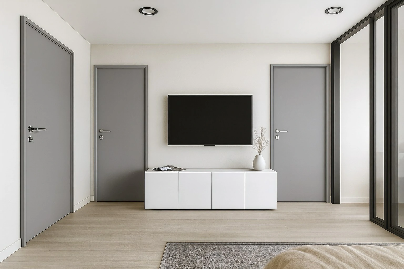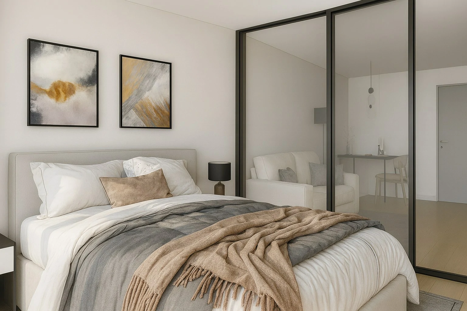 ห้องนอนสไตล์ Modern เน้นความเรียบง่ายและความสงบ เพื่อให้เป็นพื้นที่พักผ่อนที่แท้จริง เฟอร์นิเจอร์มักเป็นเตียงไม้หรือเหล็กดีไซน์เรียบ โต๊ะหัวเตียงแบบมินิมอล และตู้เสื้อผ้าแบบบิลต์อิน ที่ไม่เปลืองพื้นที่ สีที่ใช้มักเป็นโทน ขาว เทา ดำ ผสมกับงานไม้เพื่อเพิ่มความอบอุ่น พร้อมการจัดไฟ แบบซ่อนในผนังหรือหัวเตียง เพื่อสร้างบรรยากาศที่ผ่อนคลายและดูมีสไตล์